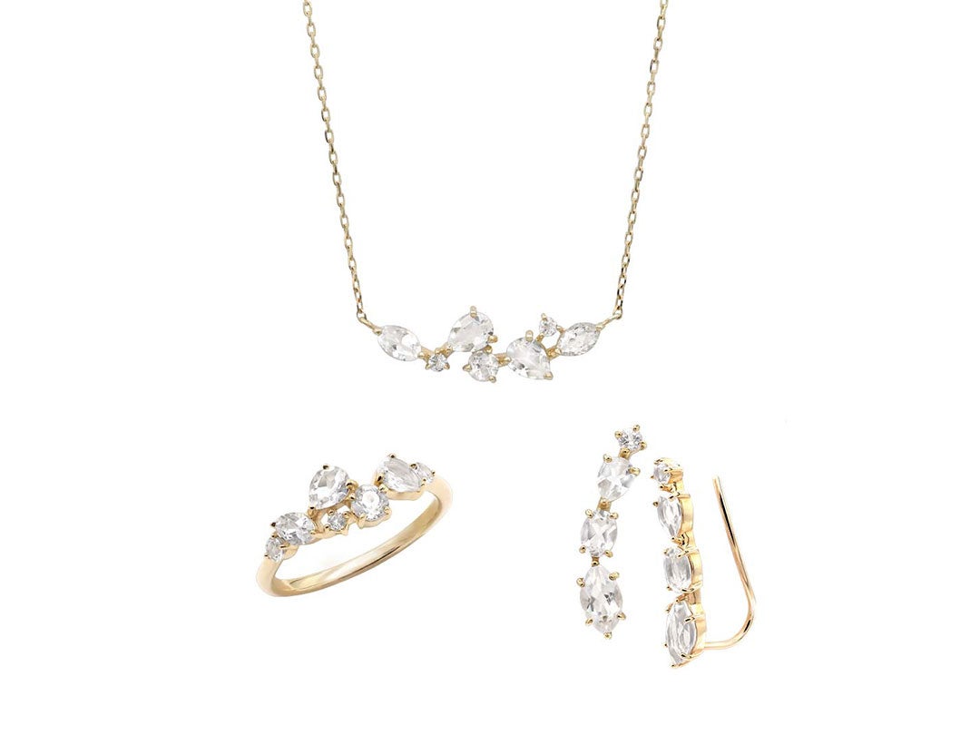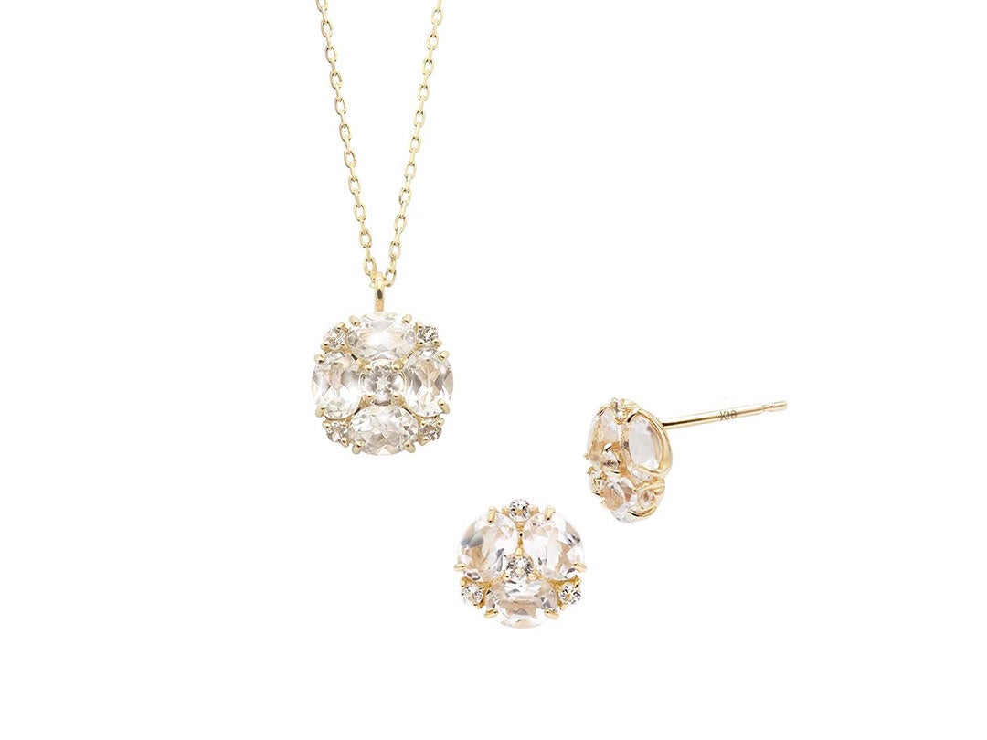 K10YG ホワイトトパーズ リング ¥35,200、K10YG ホワイトトパーズ ピアス ¥38,500、K10YG ホワイトトパーズ ピアス¥38,500、K10YG ホワイトトパーズ ネックレス ¥35,200、K10YG ホワイトトパーズ ネックレス ¥38,500