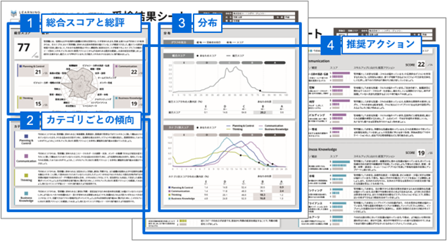 テーマごとに、今回のスコアと前回のスコア・同職種・同年齢のスコアを表示し、そのテーマのスコアに応じた推奨アクションとして、優先的に取るべき行動や学習方法を提示しています。