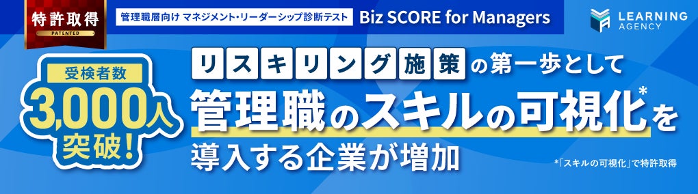 累計13,000社370万人以上の人材育成・組織開発を支援する株式会社ラーニングエージェンシー(旧トーマツ イノベーション株式会社、本社 東京都千代田区、代表取締役社長 眞﨑大輔、以下LA)では、当社が提供する管理職層向け マネジメント・リーダーシップ診断テスト「Biz SCORE for Managers」の受検者数が2022年12月末に延べ3,000人を突破したことをお知らせいたします。