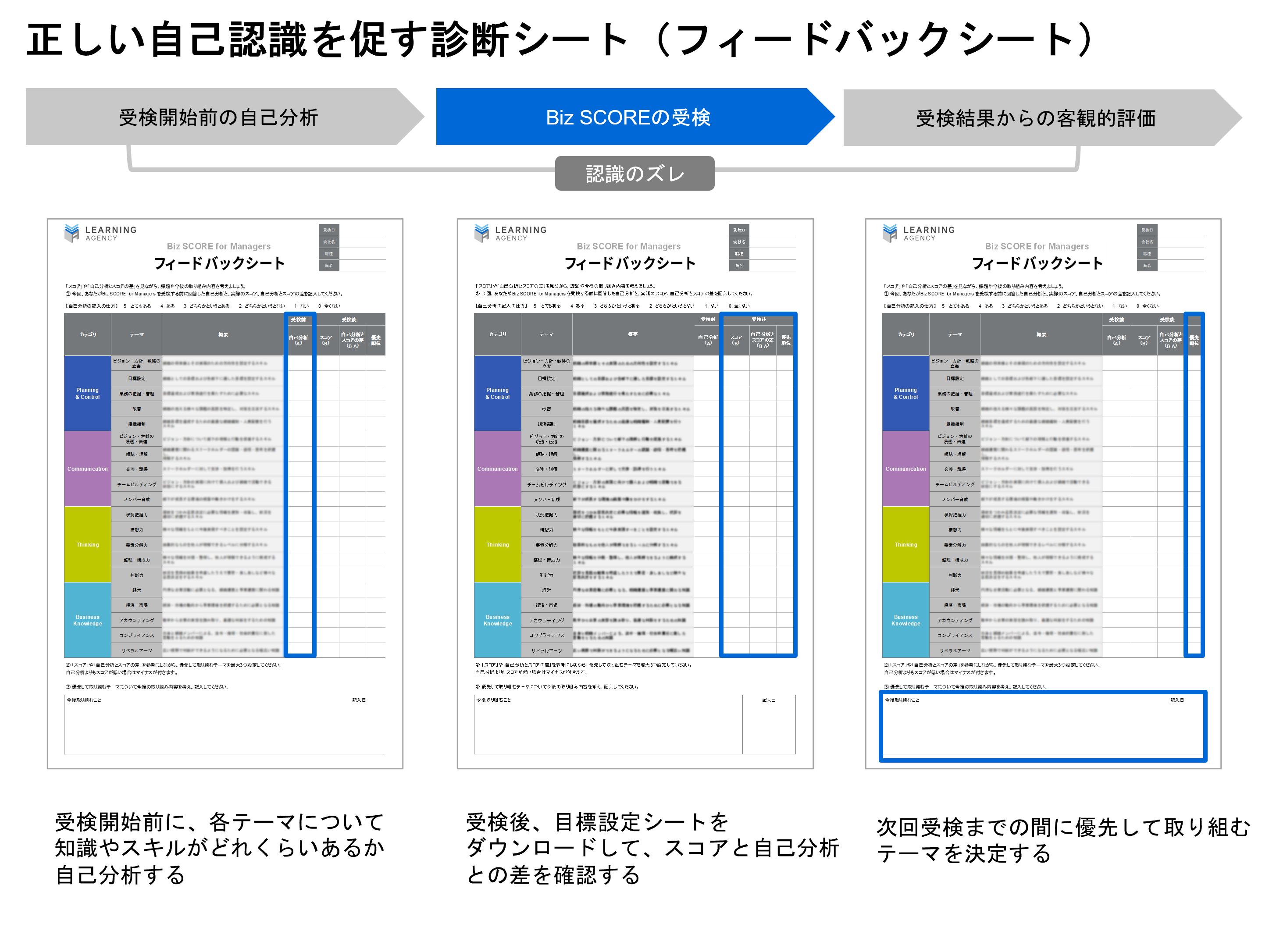Biz SCOREシリーズは、組織の中で期待される成果を継続的に出すために必要な知識・スキルを診断するテストです。自分の能力で不足している点を正しく認識することによって、健全な危機感が芽生え、それが学ぶ意欲につながります。