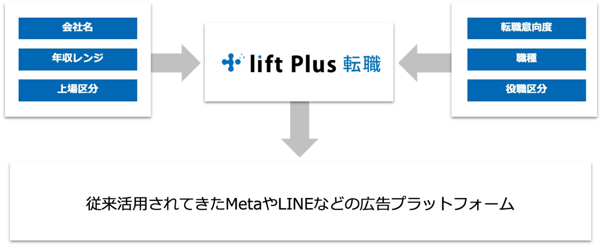 lift Plus 転職は、「LOGLY Sphere」が保有する企業データやビジネスパーソンデータと、Web上の行動履歴を分析し、転職を希望するビジネスパーソンにフォーカスした転職支援業界向けのマルチチャネル広告配信ソリューションです。