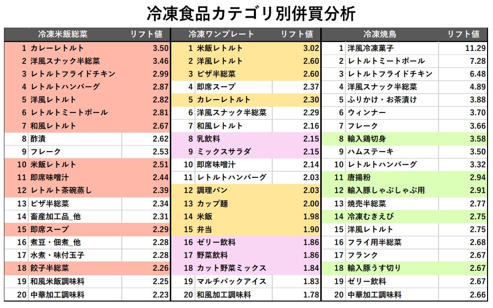 冷凍食品カテゴリごとの併買商品にはどのような違いがあるか、「冷凍米飯用総菜」「冷凍ワンプレート」「冷凍焼鳥」の3つの冷凍食品カテゴリについて、併買分析を行いました。