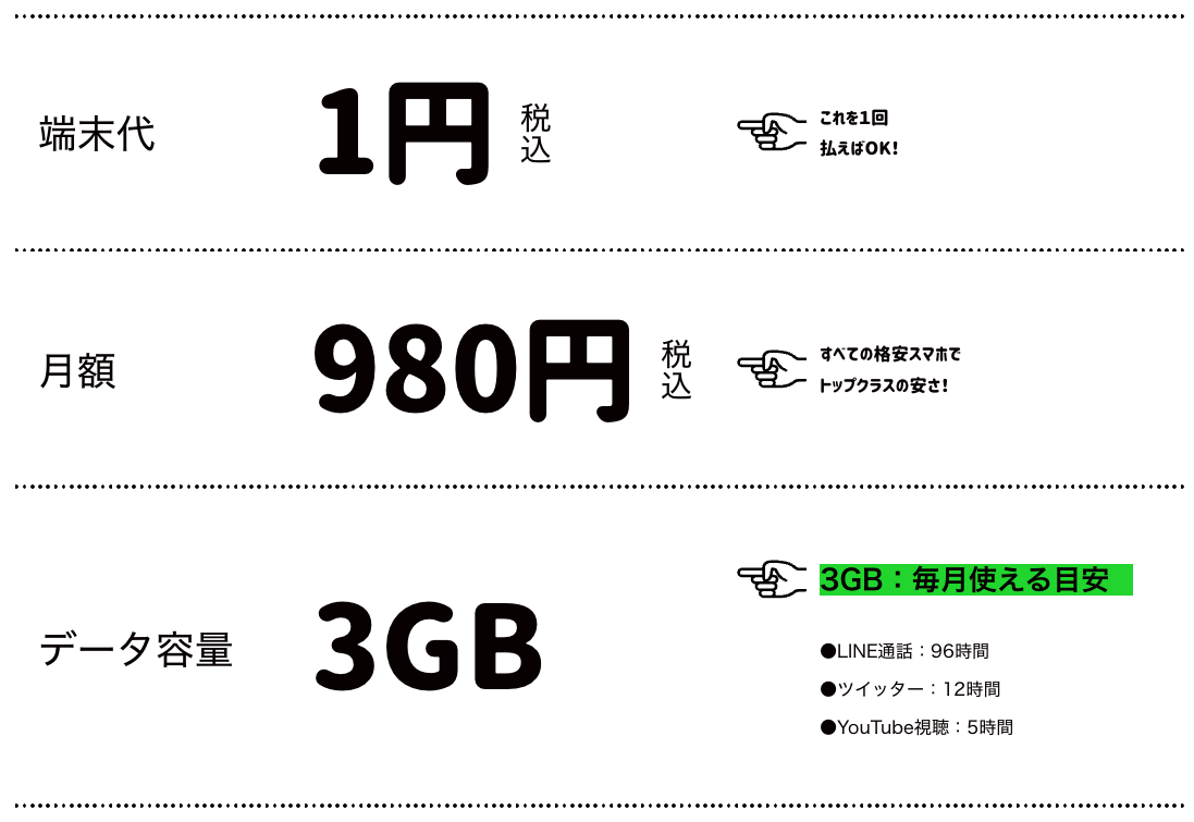 スマホはそんなに使わないけど、連絡手段として一応持っておきたい。YouTubeは、Wi-Fiで観る。LINE、SNS、ネット検索できて、毎月1000円くらいに抑えたい。こういうニーズの方も多いはずです。