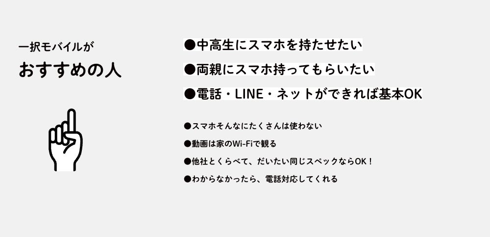 一応スマホを持ってもらいたい、高齢のご両親に。はじめてスマホを携帯する中学生に。主にはWi-Fiで使うことが多く、屋外ではLINE・ちょっとしたSNSを見るくらいでOKな人に。