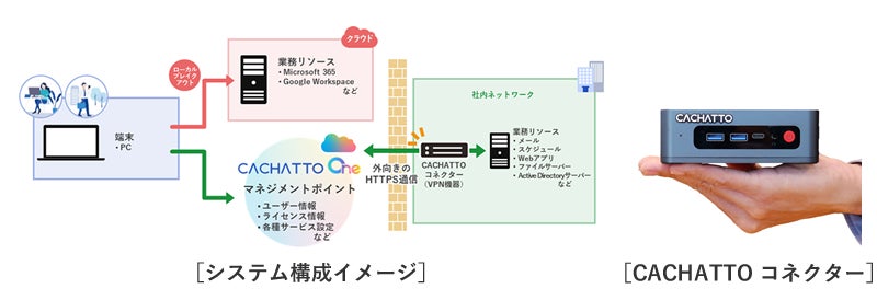 ニンジャコネクトVPNは、CACHATTO One独自の通信技術、CACHATTO Private Connect(カチャット プライベート コネクト)を利用したクラウドVPNサービスです。CACHATTOシリーズでのノウハウを活かした「高セキュリティ」「簡単導入」を特長としています。手のひらサイズのコネクター(CACHATTOコネクター)をe-Janネットワークスが提供。お客様のネットワークに設置するだけですぐに利用開始できます。