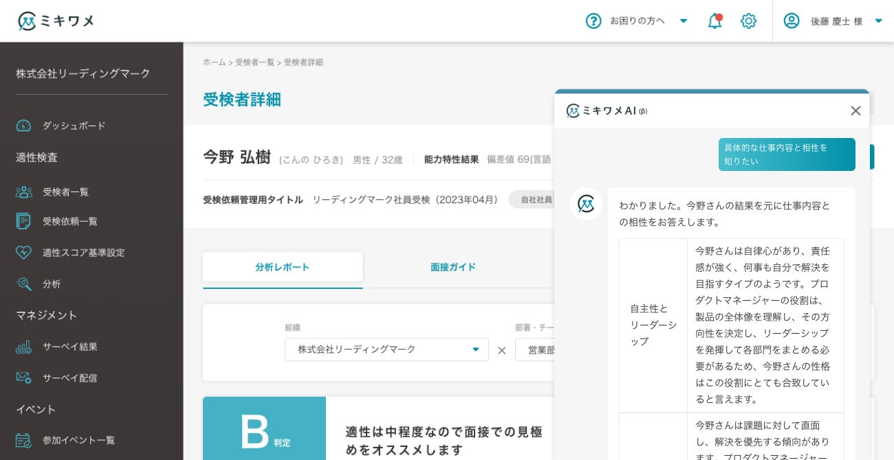 本機能では、チャットボット形式でミキワメAIに性格検査結果について質問することができます。選択肢の中から選んで質問をすると、性格検査結果を採用で活用するための、ミキワメAIによるアドバイスを受けることができます。