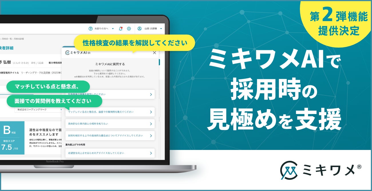 Personality Techを通じたHR事業「ミキワメ」を提供する株式会社リーディングマーク(本社:東京都港区、代表取締役社⻑ 飯⽥ 悠司、以下リーディングマーク)は、ChatGPTを活用した新機能「ミキワメAI」の第二弾機能として、人事向けソリューション「ミキワメ 適性検査」に導入し、2023年6月末~7月上旬にリリースすることを決定しました。