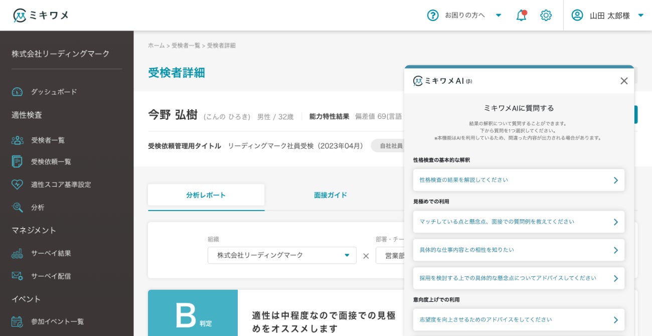 リーディングマークでは、AI技術の活用による人事支援を行っており、今後も「ミキワメ 適性検査」や「ミキワメ ウェルビーイングサーベイ」において、新機能の開発やサービスの向上に努めてまいります。