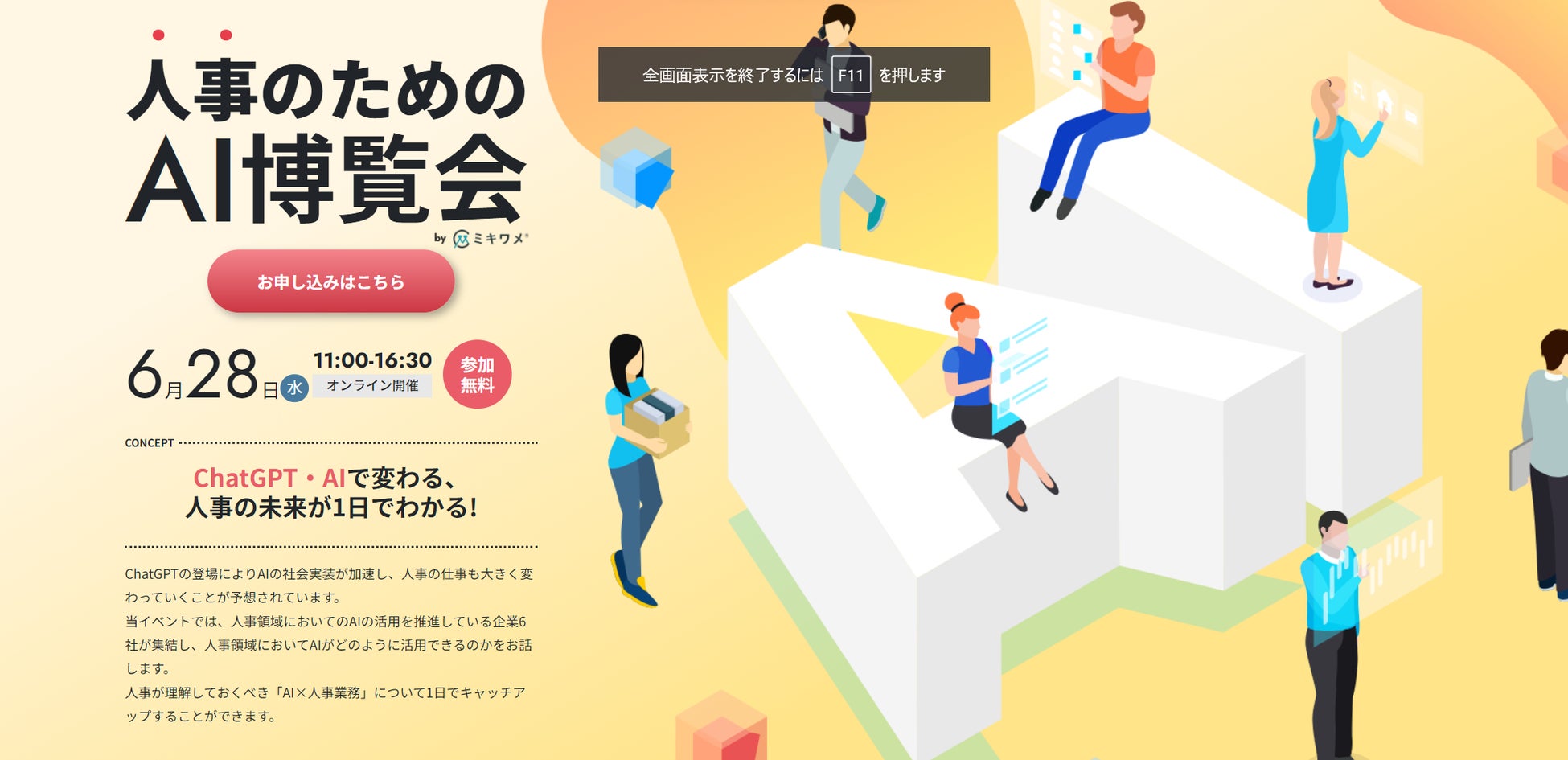 6月28日(水)には弊社が主催の「人事のためのAI博覧会」という無料オンラインイベントも開催予定です。人事領域においてAIの活用を推進している企業6社が集結し、「どのように活用できるのか」など人事が理解しておくべき「AI×人事業務」について1日でキャッチアップすることができます。詳細は下記をご参照ください。