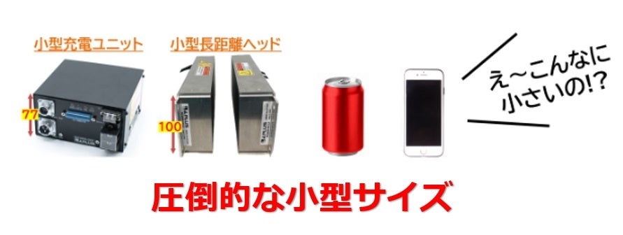 低床型AGV搭載を考え、とにかく小型化を追求しました。身近なものと比べても圧倒的な小型サイズのユニットになっています。