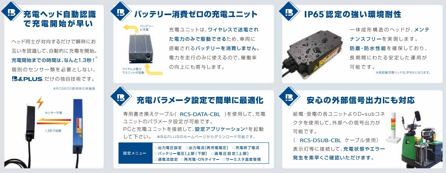 RCSシリーズでは、対向時の起動時間やIP65の防水ヘッド、バッテリーからの消費ゼロなど様々な特徴を有しています。低床型AGV向けワイヤレス充電は、それらの特徴をそのまま継承し、使い勝手が非常に高い製品です!