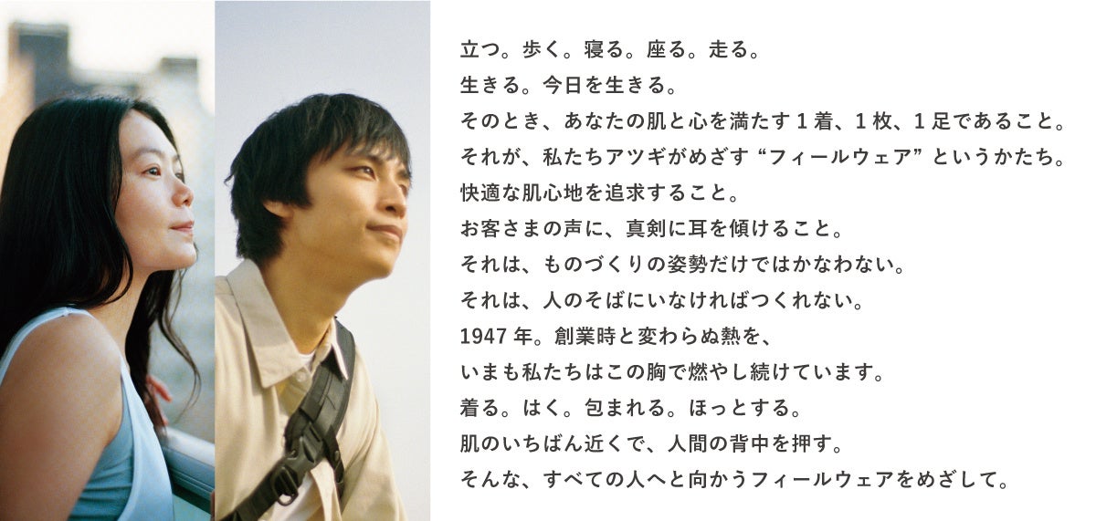 アツギ株式会社は、レッグウェア・インナーウェアメーカーとして女性の生活に寄り添い続けてまいりました。お客様の価値観・ライフスタイルが大きく変容していく中で、すべての生活者の皆様に向けてより良い商品やサービスをお届けするべく、企業の存在意義と目指すべき姿を見直しました。そしてこのたび、アツギはすべての人に寄り添い、従来のレッグウェア・インナーウェアというカテゴリーを超えた、肌に心地よい・心に響く衣服(フィールウェア)をお届けする企業へと生まれ変わります。