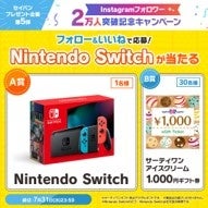 本キャンペーンは3月から7月まで全5回開催しており、最終回となる第5弾ではInstagramフォロワー2万人突破を記念して、抽選でNintendo Switchを1名様、サーティワン アイスクリーム 1,000円ギフト券を30名様にプレゼントいたします。