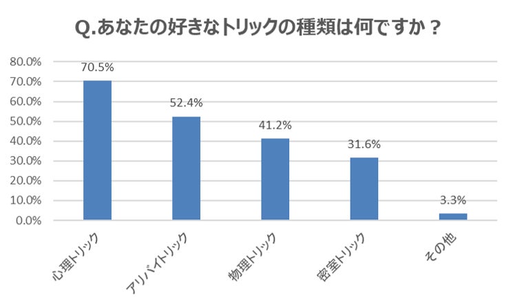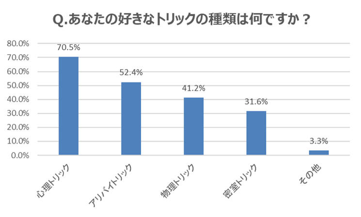 好きなトリックの種類は『心理トリック』が70.5%で1位、続いて『アリバイトリック』が52.4%で2位