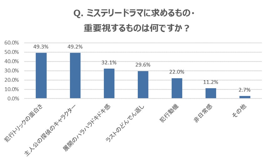 ミステリードラマが本来持つ“謎” という最大の魅力のほかにも、先の質問での結果のように「心理トリック」が好まれたり、「主人公の探偵のキャラクター」が重要視されるなど、心に響く人間ドラマ的要素で人を惹きつけるものがあるということが伺えます。