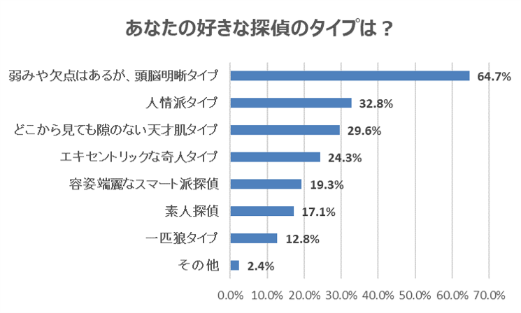 好きな探偵のタイプは、『弱みや欠点はあるが、頭脳明晰タイプ』が圧倒の64.7%で1位