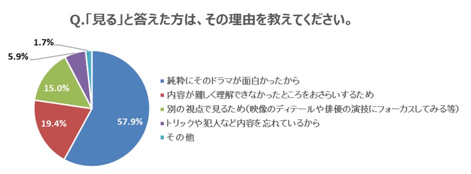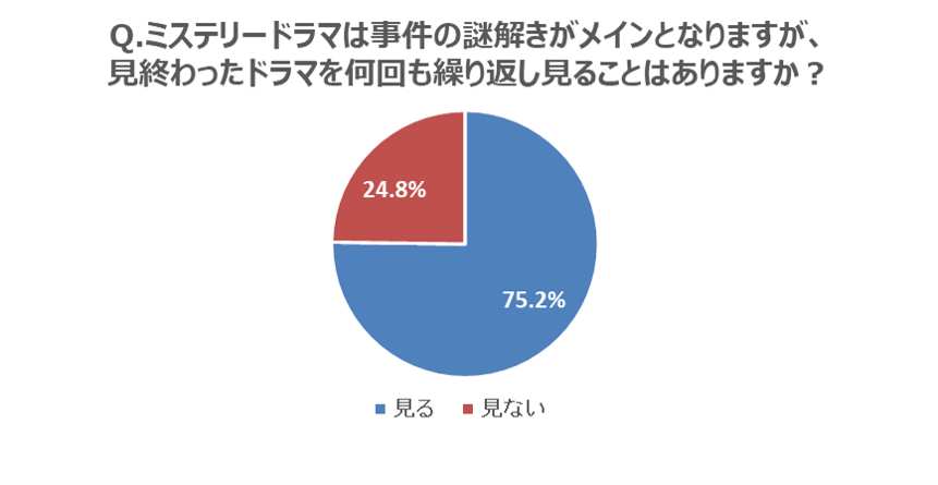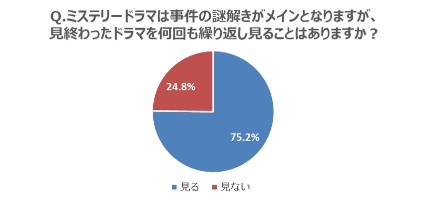 『繰り返し見る』派は75.2%と4分の3を占める結果に。ミステリーは犯人当てや犯行動機、どうやって犯行を行ったのかなどを突き止めていくものですが、結末は分かっていても何度も繰り返し見てしまうのは、「純粋にドラマが面白かったから」という理由が過半数でした。