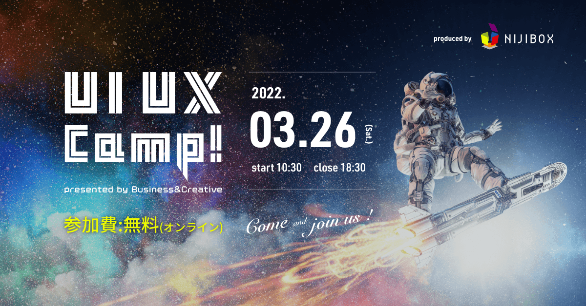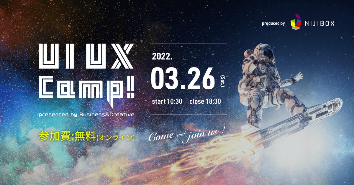 株式会社ニジボックス(本社:東京都中央区 代表取締役社長 兼 CEO:入江翔平)は、3月26日、「Business & Creative」のスペシャルイベントとして、大型デザインカンファレンス「UI UX camp! - presented by Business &Creative」をオンライン開催いたします。