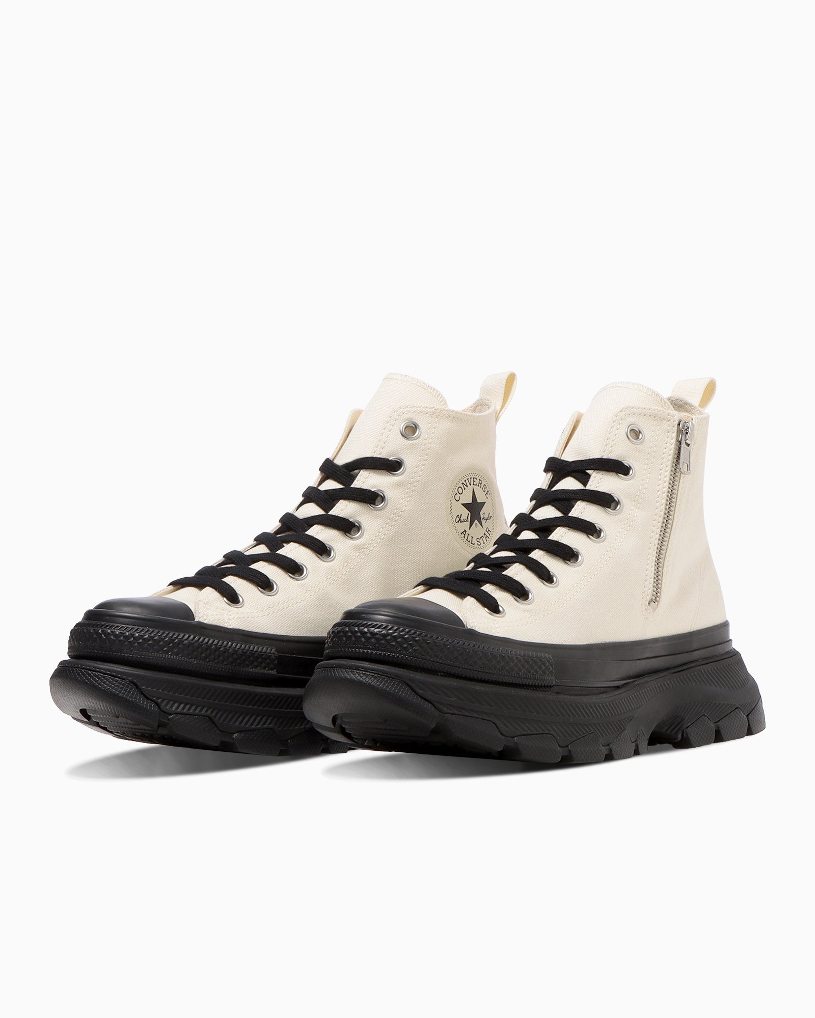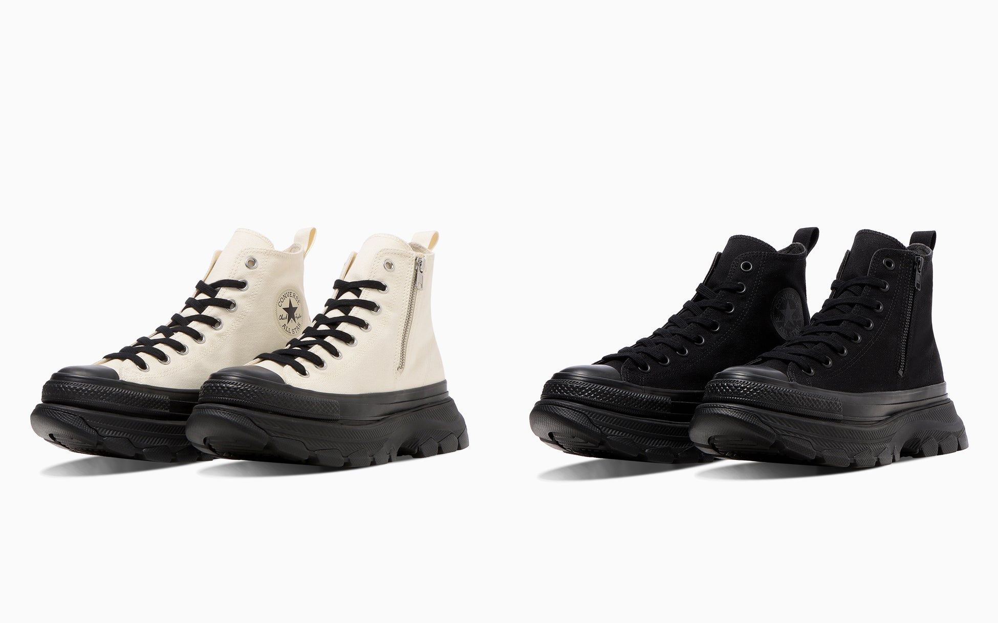 凹凸が特徴的な厚みのあるラグソールを採用した直営店限定のオールスターアレンジモデル。アーカイブのパターンをベースにしたインパクト抜群のデザインです。サイドジッパーを採用することで着脱性とフィット性を向上させています。丸紐やガンメタのハトメのディテールによりシックにまとめ、ブーツライクに履くことのできる一足。