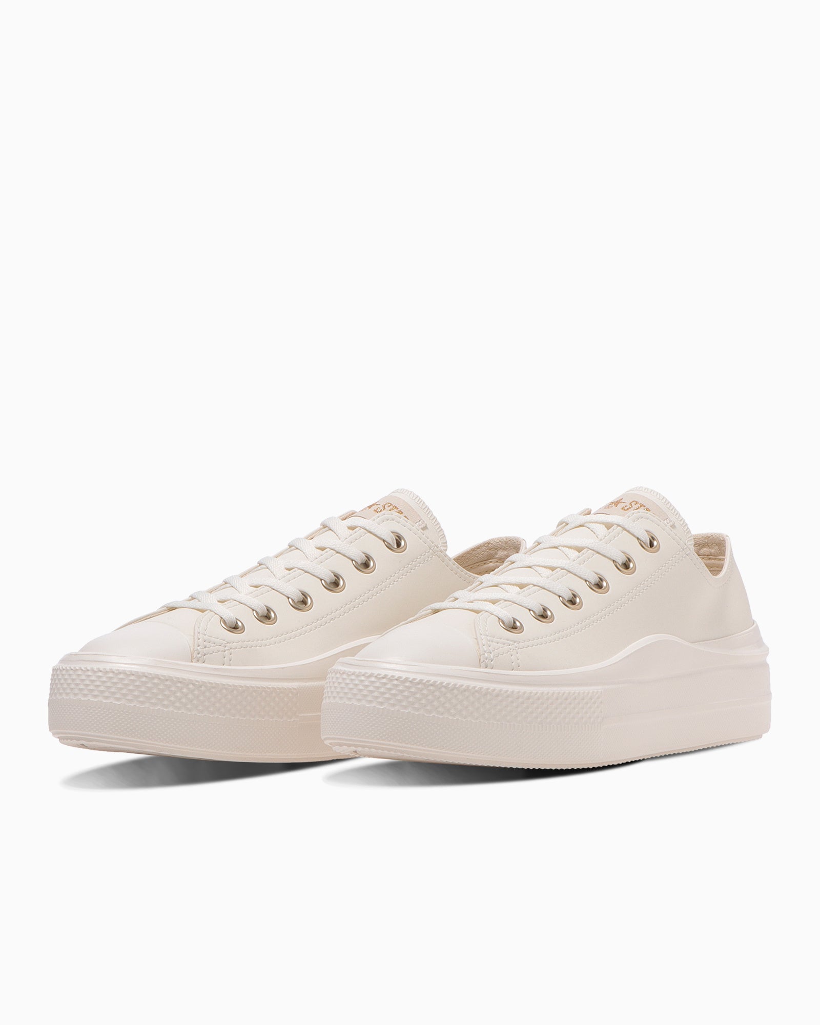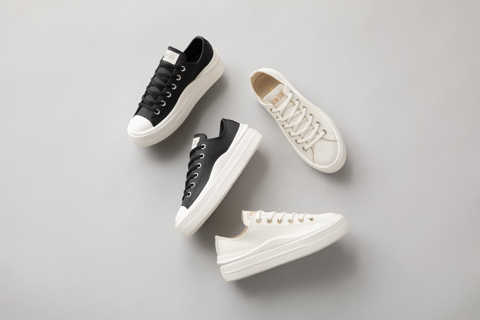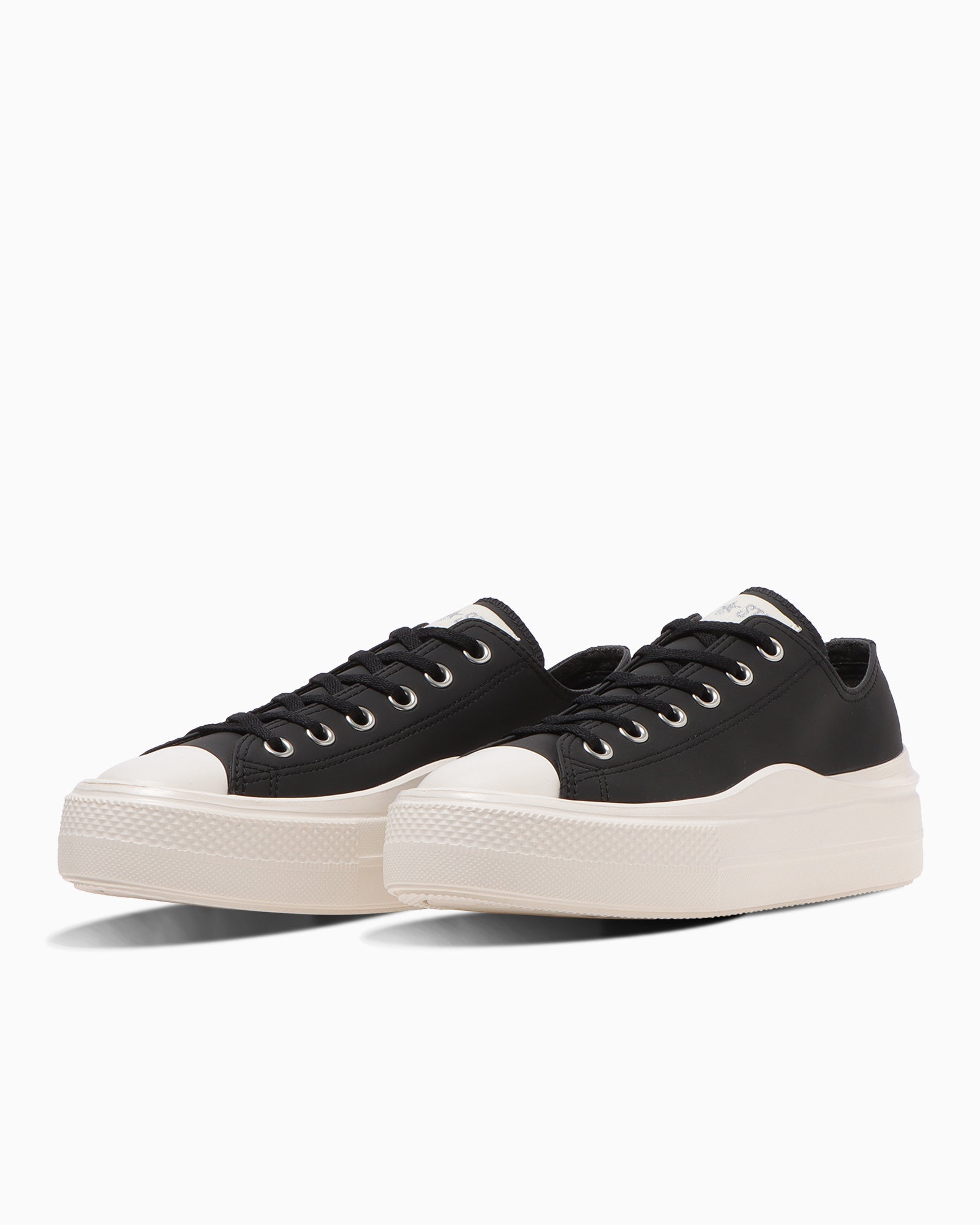 オールスター ライトのソールと素材のアレンジモデル。トレンドのウエーブデザインを取り入れたアウトソール設計がポイントの軽量厚底モデルです。アッパーにはレザーライクな質感のシンセティック素材を採用し、上品さと実用性を両立。ハトメやタンラベルのロゴ、シューレースチップにはメタリックの要素を取り入れ、華やかなデザインに仕上げています。