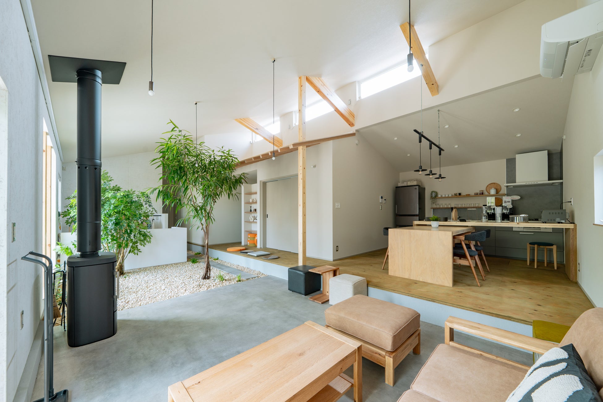 勾配天井で開放的な空間を感じられる設計により、限られた敷地条件でも豊かに暮らせる空間づくりを実現しました。