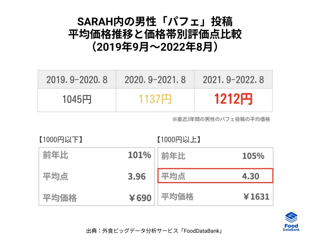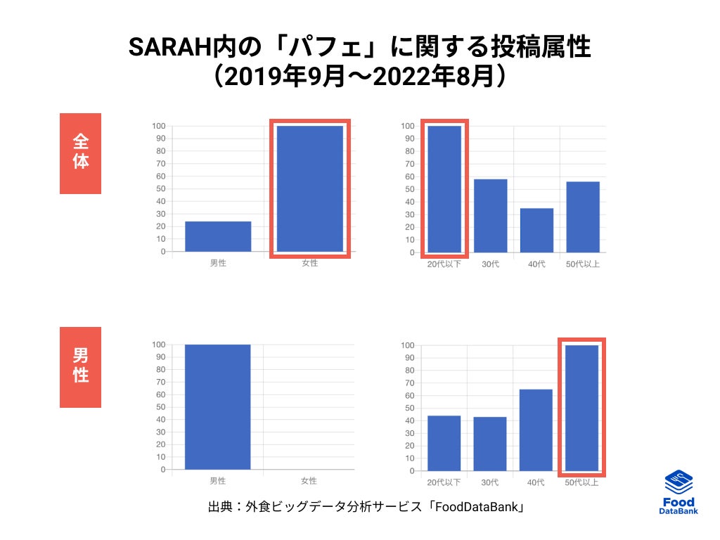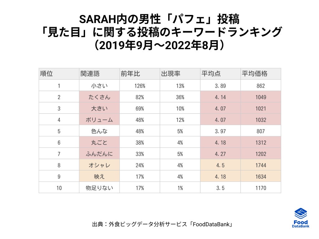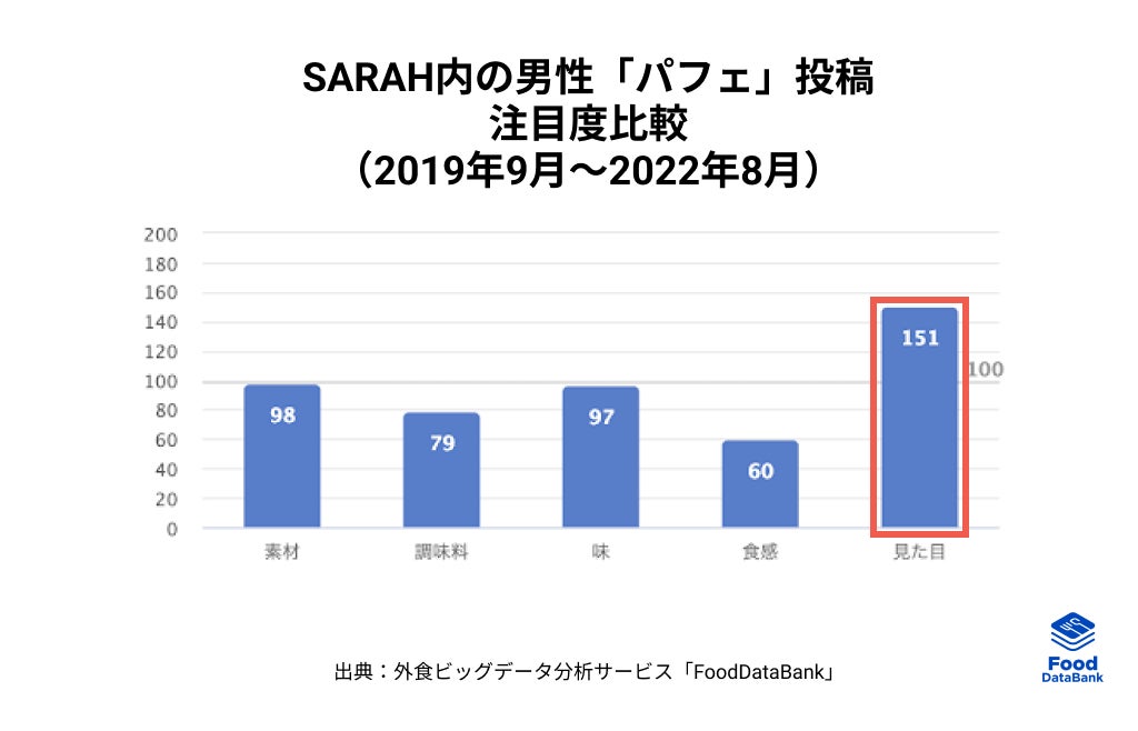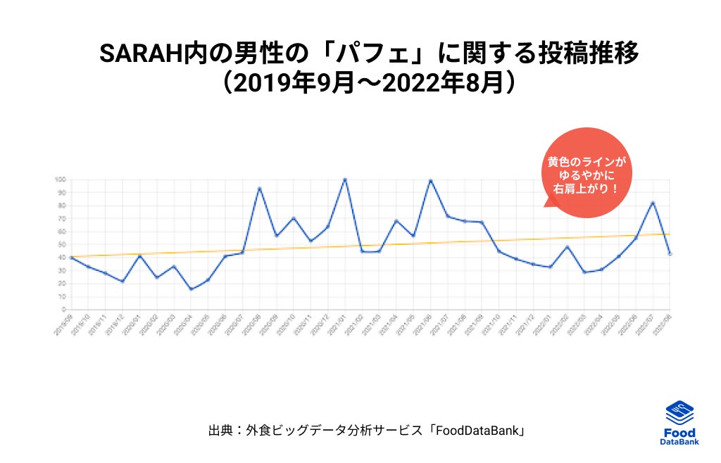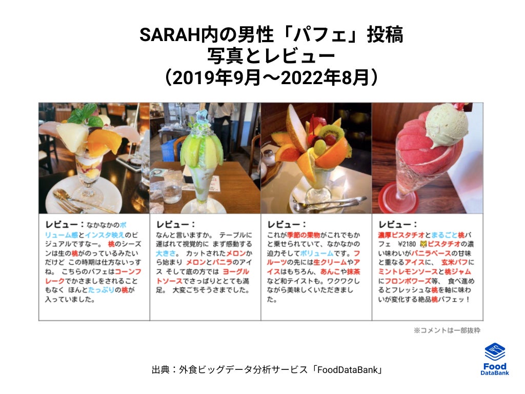 累計90万件以上のおいしい一皿が集まるグルメコミュニティサービス「SARAH」を運営する、株式会社SARAH(本社:東京・千代田、代表取締役:髙橋洋太)は、「FoodDataBank トレンドレポート2022年9月号」を公開いたしました。今月のテーマは、ゆるやかに男性人気が上昇しつつある「パフェ」について、ユーザーの投稿情報が集まる外食ビッグデータ分析サービス「FoodDataBank」から見える結果をお届けします。