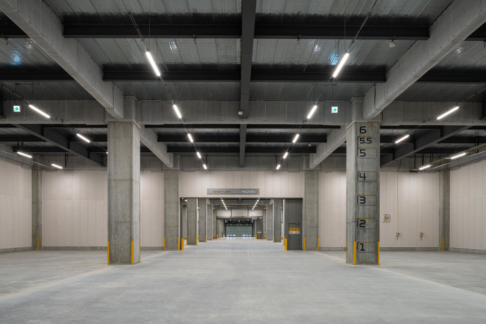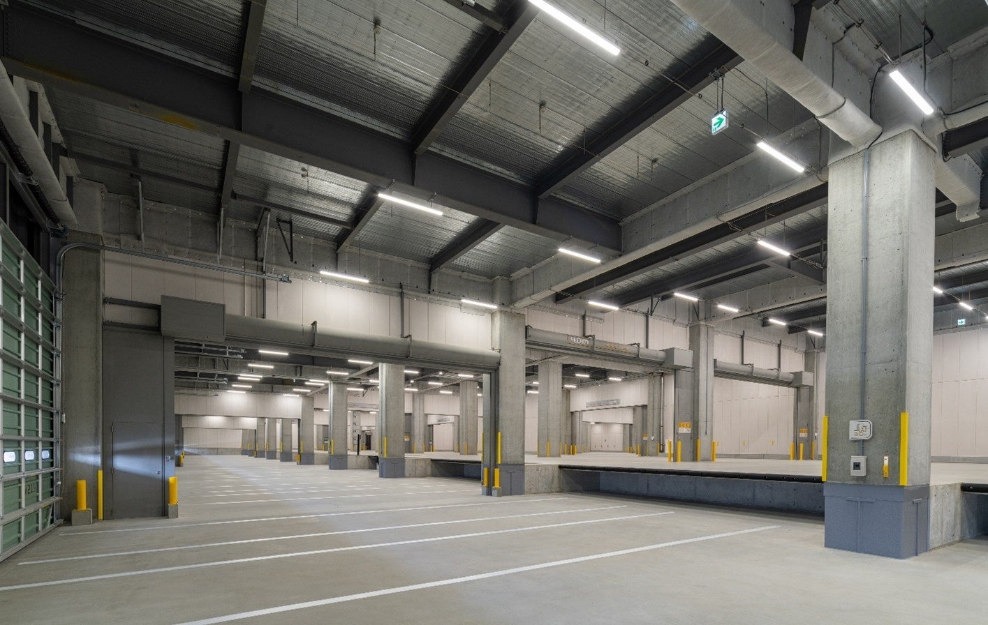 設であり、2階、3階及び4階へ大型車両が直接乗り入れ可能なランプウェイを設け、各階に両面トラックバースを備えるマルチテナント型の施設です。ランプウェイは上り専用と下り専用をそれぞれ2基ずつ、計4基設置するクアドラプルランプウェイ方式として、トラックバースは計224台の大型車が同時接車可能で、30台分のトラック待機場と合わせて、効率的な入出庫オペレーションを実現します。