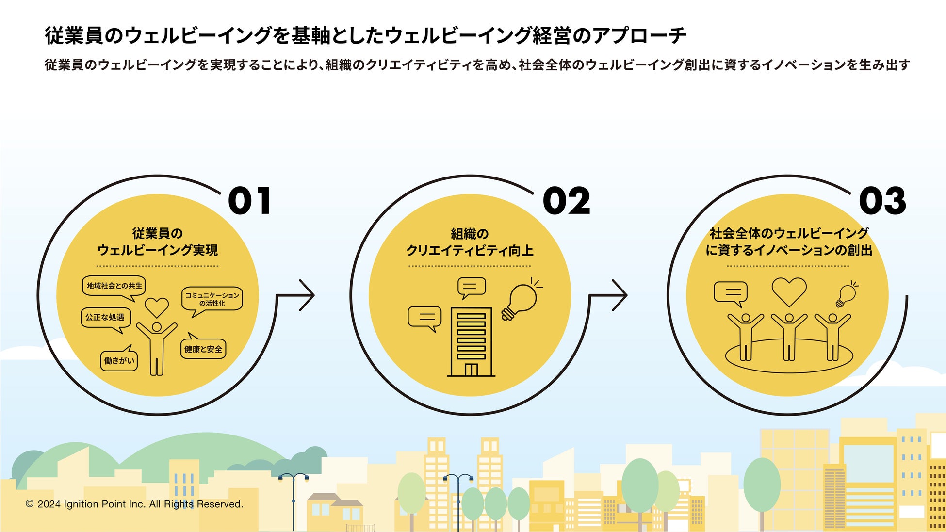 イグニション・ポイントは、従業員のウェルビーイングを向上させることで組織の創造性が高まり、ひいては社会全体のゆたかさに貢献するイノベーションを生み出すという“インサイド・アウト・アプローチ”に基づき、従業員のウェルビーイングを重視しています。