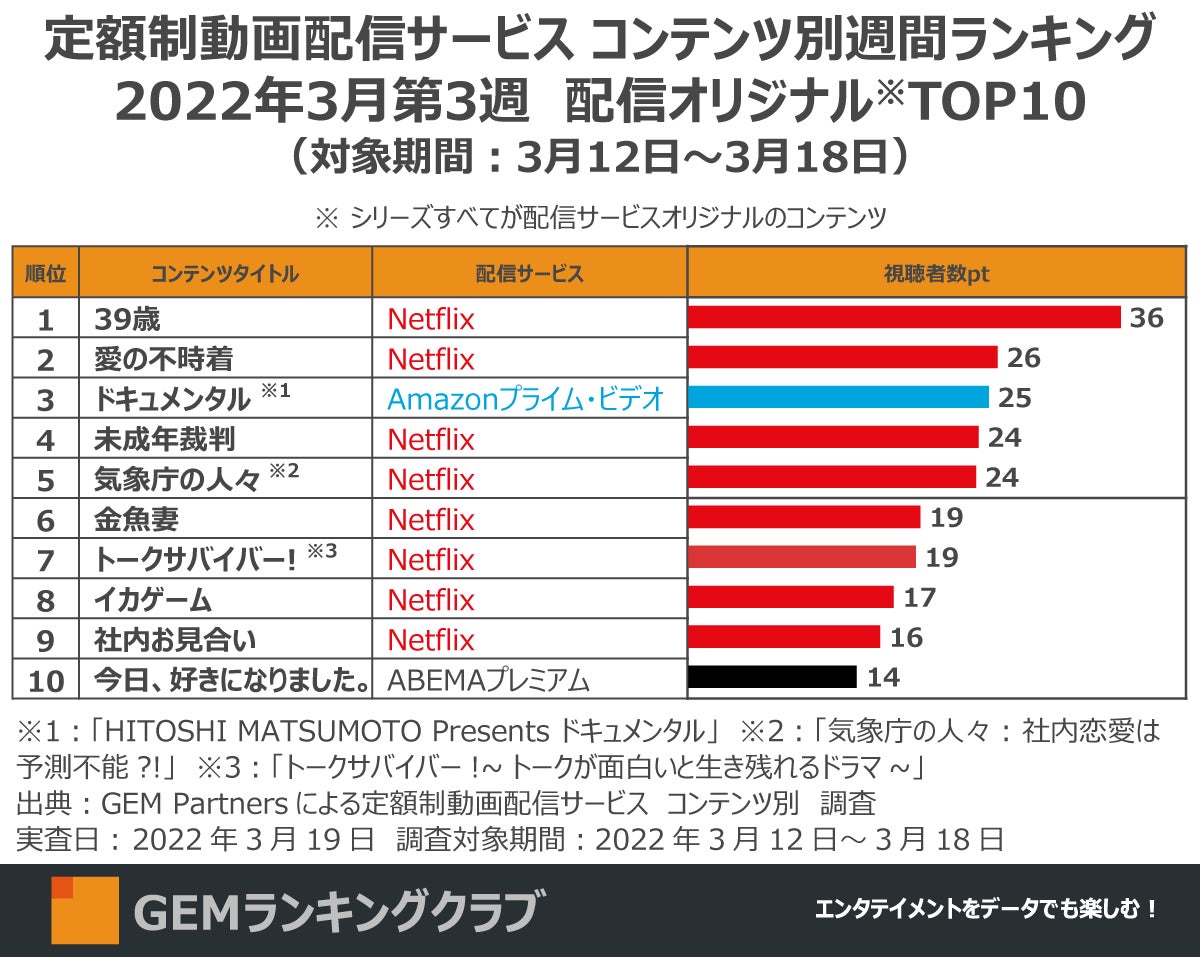 『進撃の巨人』が首位を維持、配信オリジナルTOP10では『39歳』ほかNetflix韓流ドラマが好調~定額制動画配信サービス コンテンツ別週間ランキングTOP20(2022年3月第3週)