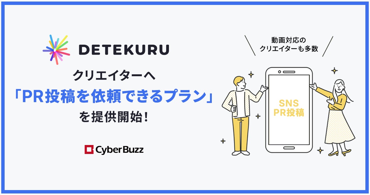 ソーシャルメディアマーケティング事業を展開する株式会社サイバー・バズ(本社:東京都渋谷区、代表取締役社長:髙村 彰典)は、当社が運営する企業とクリエイターのマッチングプラットフォーム「DETEKURU」より、静止画や動画といったSNSコンテンツ制作を得意とするクリエイターへ月額制でPR投稿を依頼できる新プランを提供開始いたしました。これにより、従来通りDETEKURU上で素材制作を依頼するだけでなく、PR投稿をできるクリエイターを募集することも可能になります。