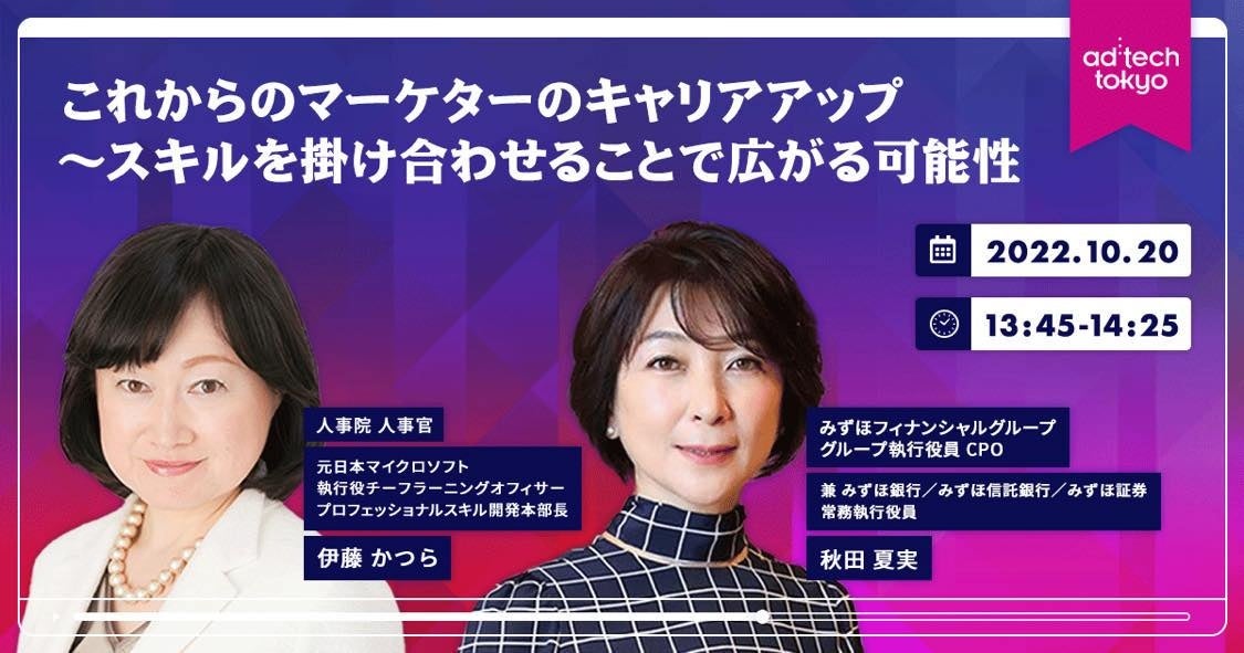 マーケティングの国際カンファレンスを多数企画・実施しているComexposium Japan(コムエクスポジアム・ジャパン)株式会社(本社:東京都港区、代表取締役社長:古市優子)は、2022年10月20日(木)、21日(金)に東京ミッドタウン&ザ・リッツ・カールトン東京で行われる、アジア最大級のマーケティングの国際カンファレンス「ad:tech tokyo(以後 アドテック東京)」の基調講演(Keynote)に、みずほフィナンシャルグループ グループ執行役員 人事グループ副グループ長 秋田 夏実氏 と元日本マイクロソフト 執行役 で、現在 人事院 人事官として活躍する伊藤 かつら氏の登壇が決定したことを発表します。