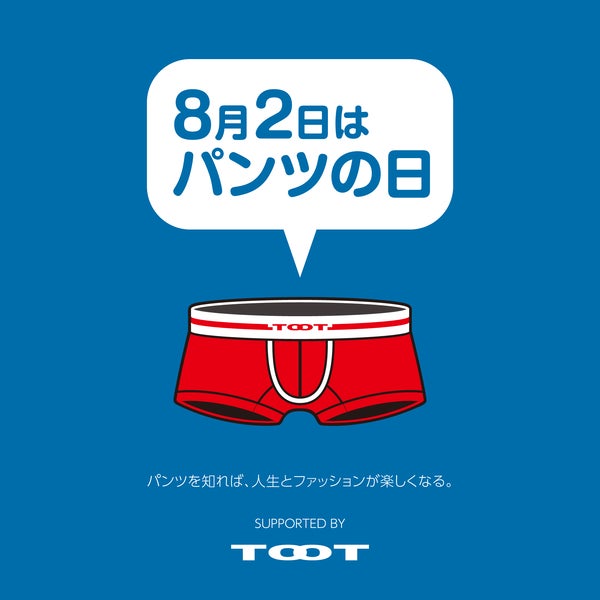 株式会社 TOOT(トゥート:東京都渋谷区 代表取締役社長 枡野恵也、以下「TOOT」 https://www.toot.jp )は、8月2日の「パンツの日」を記念して、今年もパンツについて改めて考える啓発活動を広く展開いたします。起きているときも、寝ているときも、24時間穿いているのに、ついナイガシロにされがちなパンツ。年に一度のこの日を、パンツから人生とファッションが楽しくなる日にしてみませんか?
