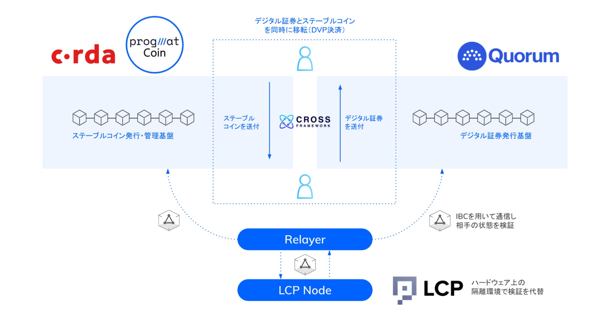 今回の実証実験では、デジタル証券に対するステーブルコインによるクロスチェーン決済を想定しています。Progmat Coin基盤のブロックチェーン層であるCordaと、デジタル証券を扱うブロックチェーン基盤を想定したQuorumを相互接続し、両ブロックチェーン上のトークンの同時移転を検証します。