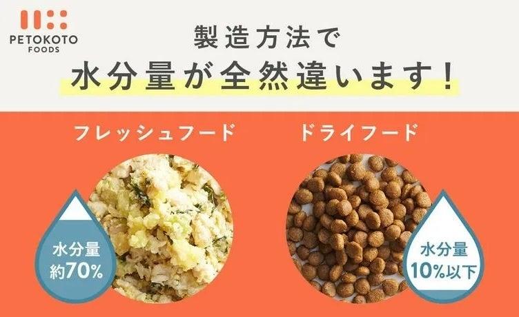 熱中症対策の2大ポイントは「水分摂取」と「体を冷やすこと」です。そこで愛犬・愛猫におすすめなのがフレッシュペットフードです。フレッシュペットフードは水分量が約70%のウェットフードで、新鮮な肉や野菜を使用して保存料や酸化防止剤を添加しない家族のためのごはんです。