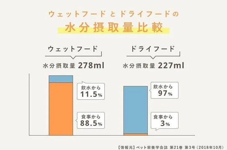 実際にウェットフードを食べた犬とドライフードを食べた犬の水分摂取量を比較したところ、20%ほど水分摂取量が少なかったという結果(※2)が出ています。