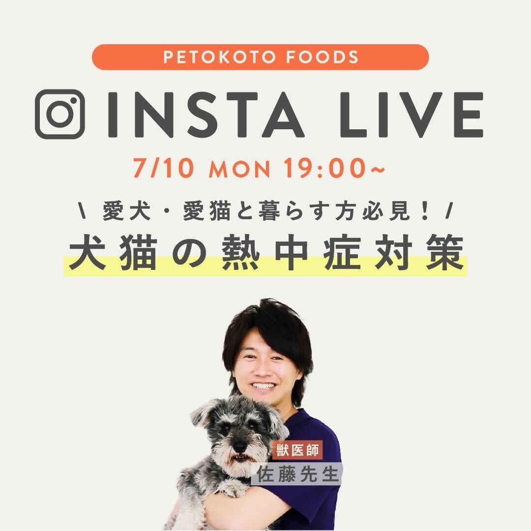 7月10日(月)午後7時より、ペトコトフーズの商品開発責任者でもある獣医師の佐藤先生が「熱中症対策」をテーマにしたインスタライブを開催します。