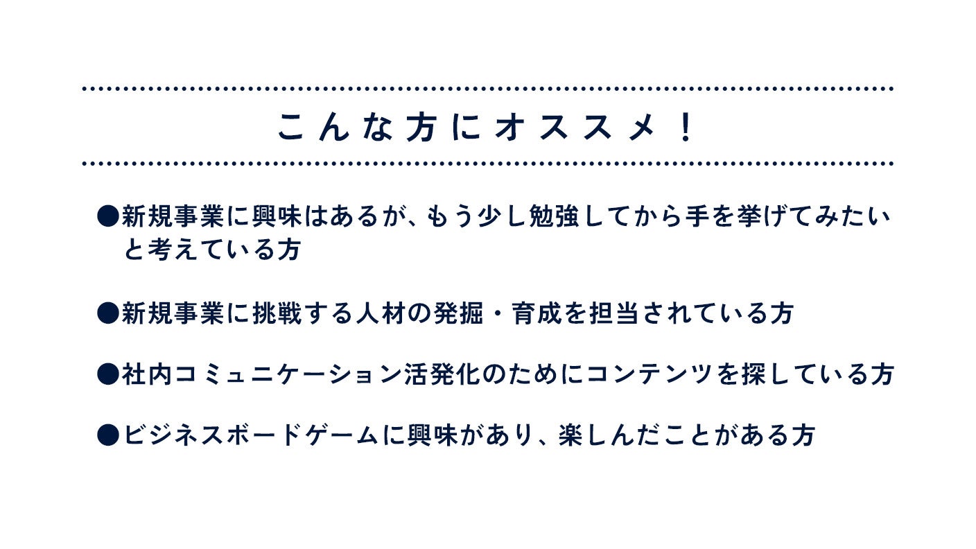 新規事業を学びたい方はもちろん、友人・同僚と純粋に遊びたい、社内コミュニケーションを活性化したい等、様々なシーンでご活用いただけます。