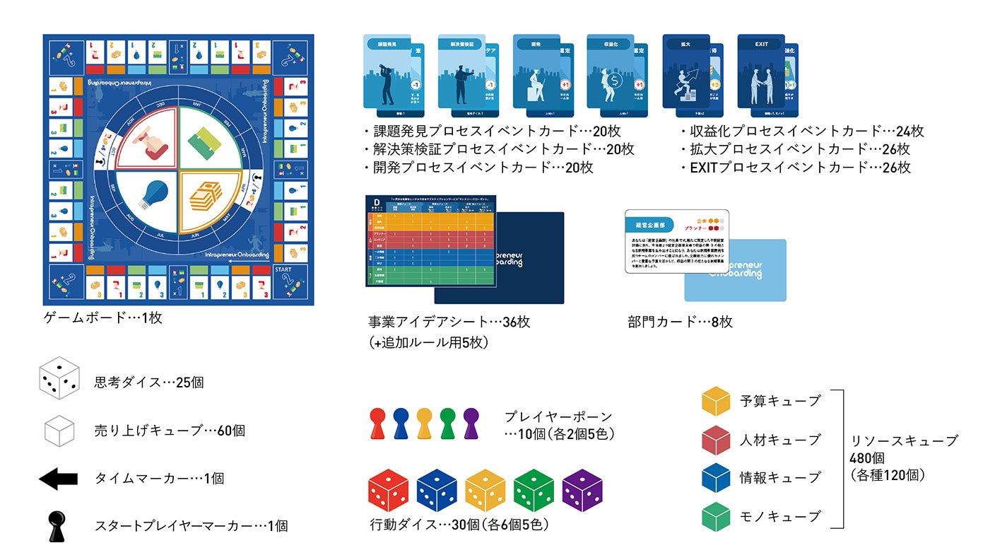 昨今非常に多くの企業が取り組みを強化している「社内起業」や「企業内新規事業」を気軽に楽しく体験してもらうことで、興味・関心を持つ人材を発掘・育成したり、個人で遊びながら学習するためのボードゲームです。不確実性の高いVUCA時代の到来やコロナ禍により、既存事業を展開するだけでは企業が継続的に生存・成長することが難しくなる環境下において、新規事業開発やイノベーション創出への取り組みを強化する企業がますます増えています。