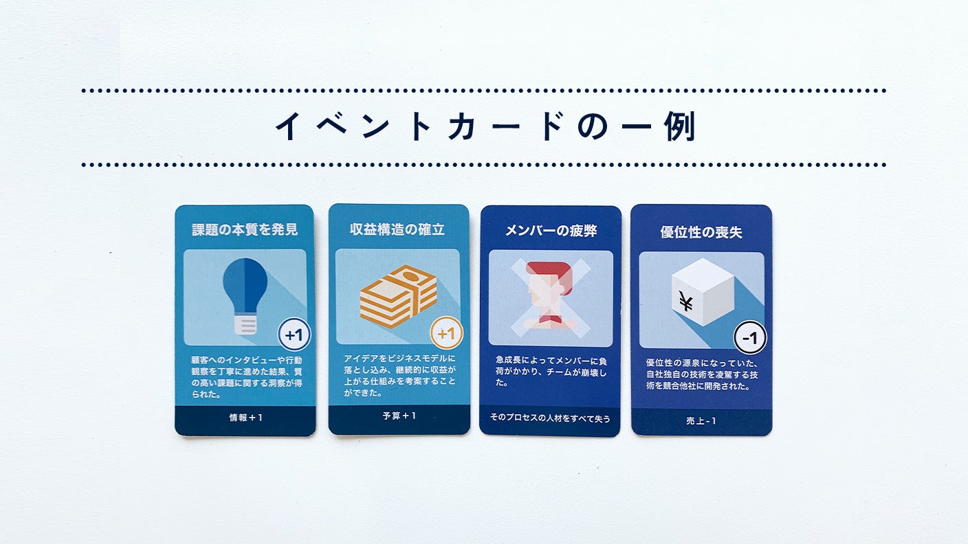 イベントカードは、フェーズ / プロセスごとに実際に起こり得るイベントやトラブルを記載したものです。これらは、新規事業開発の現場において頻発するリアルな経験をもとに設定されているので、実際の新規事業の面白さや難しさを擬似体験することができます。