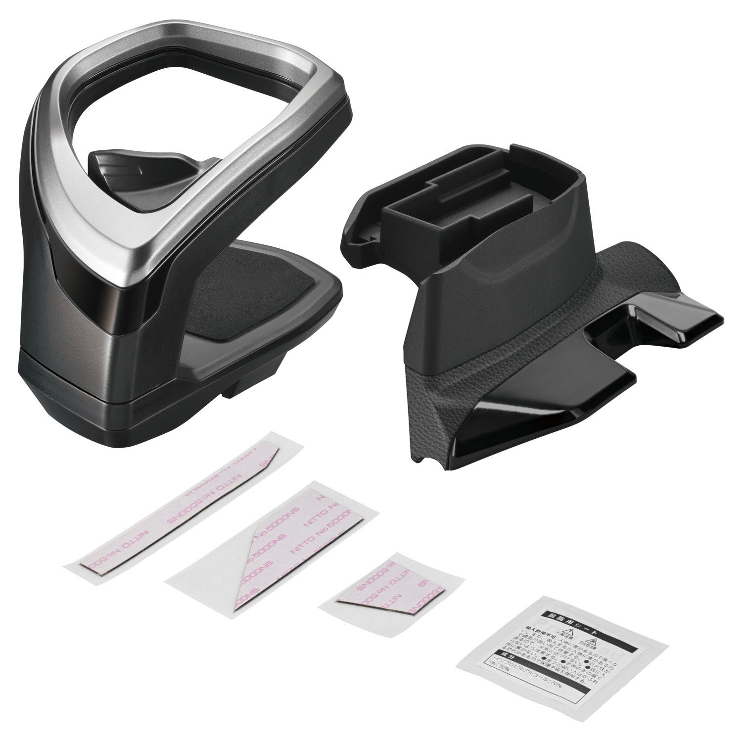 ドリンクホールド部とコンソールとをつなぐパーツがカローラクロス専用に設計されています。センターコンソール助手席側に取り付けてドリンクホルダーを増設できます。取り付けは簡単、粘着テープでセンターコンソールに貼り付けるだけです。
