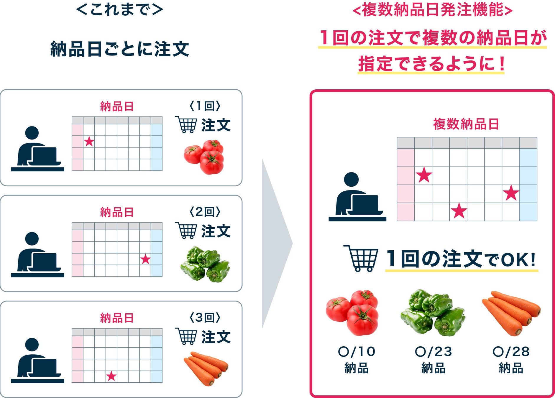 通常の発注方法では、1回の注文で1つの納品日を選択することができますが、この機能を利用すると1回の注文で複数の納品日を指定することができ、注文作成の効率アップが期待できます。