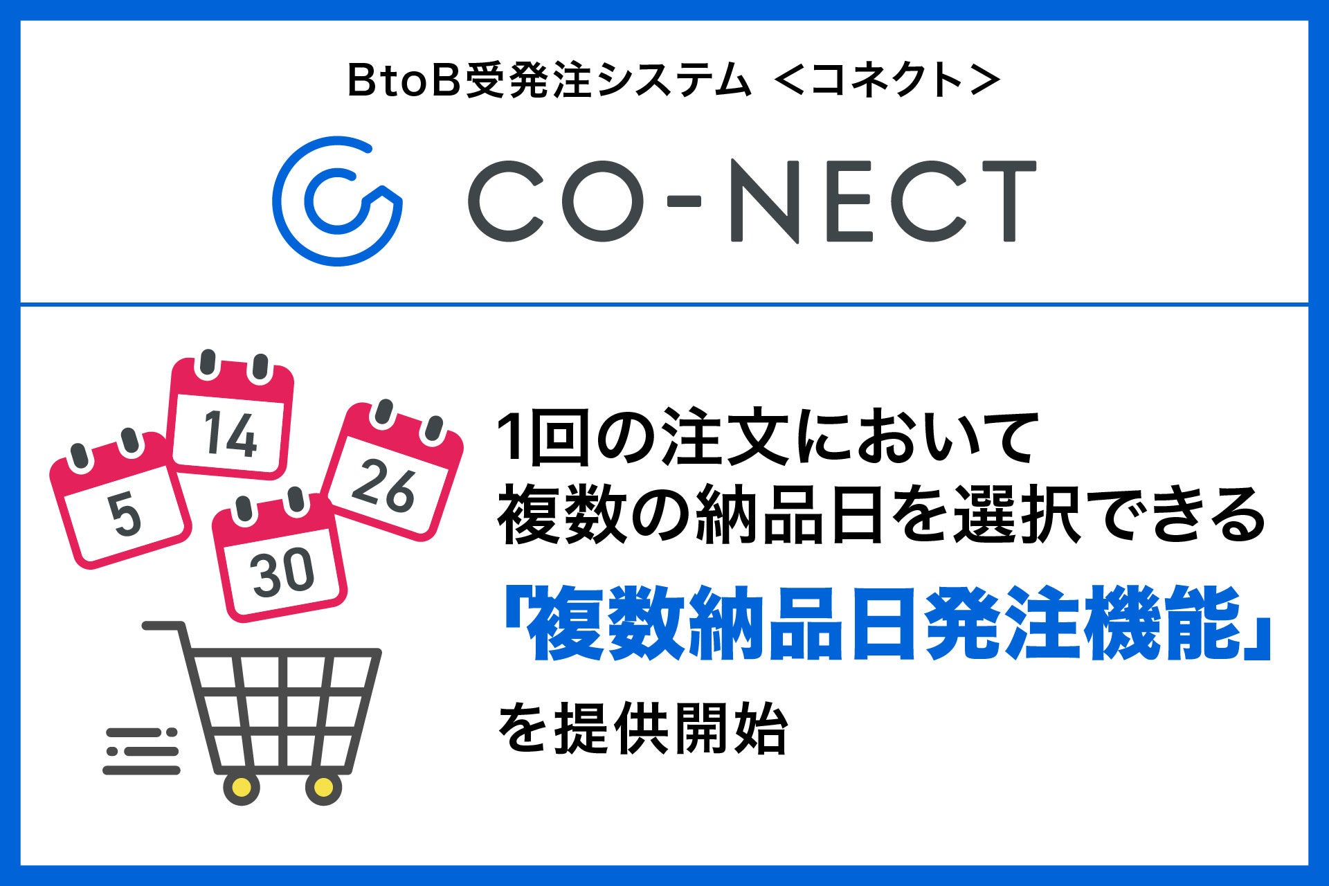 BtoB受発注システムCO-NECT(コネクト)およびBtoB受注業務アウトソーシング「CO-NECTクロート」を運営するCO-NECT株式会社(本社:東京都千代⽥区、代表取締役:⽥⼝雄介)は、BtoB受発注システムCO-NECTにおいて、1回の注文において複数の納品日を選択できる「複数納品日発注機能」を提供開始したことをお知らせいたします。
