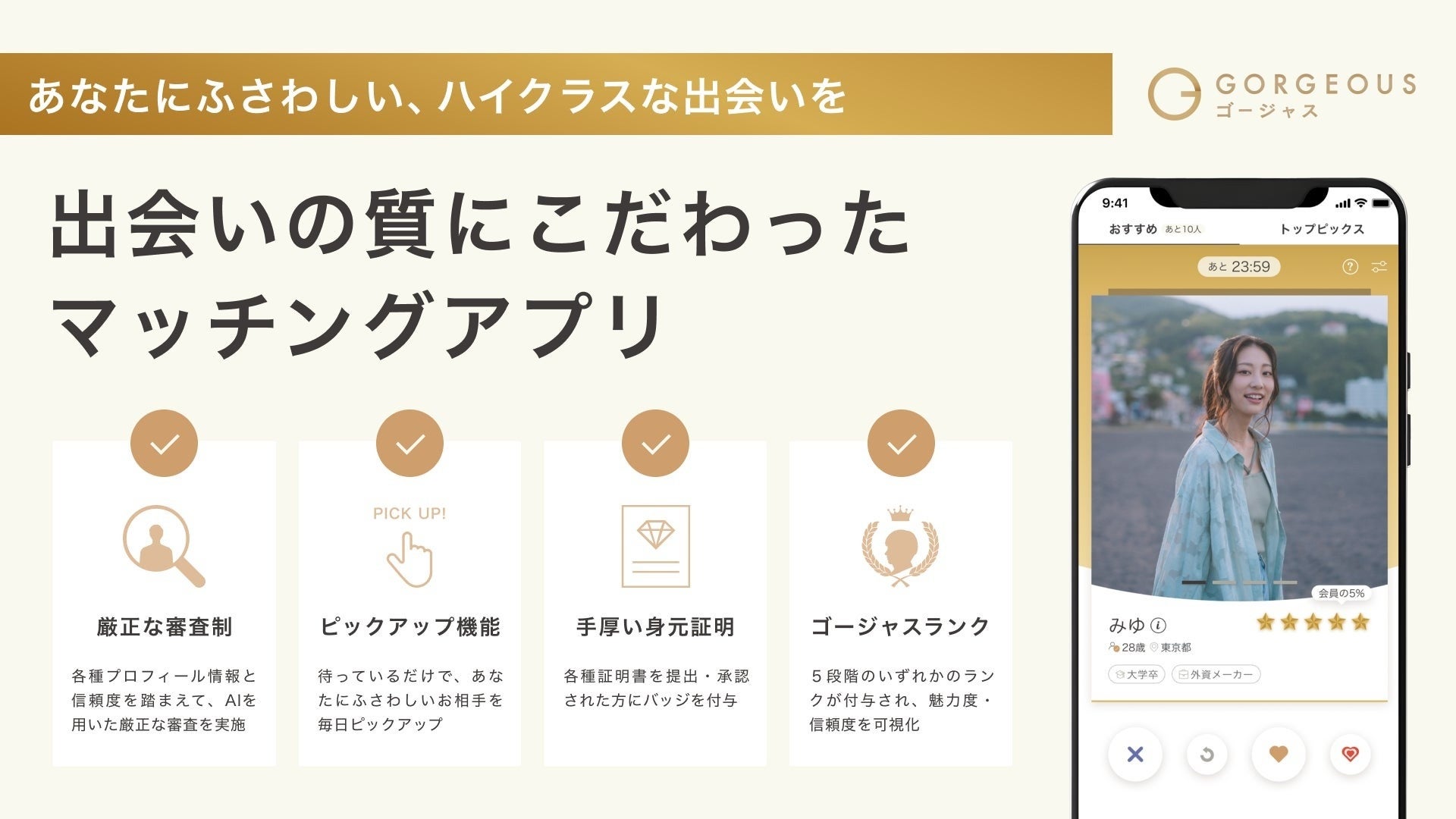 2022年10月サービスリリース。ゴージャスは、理想のお相手と出会いたいと考える男女をターゲットとした、「あなたにふさわしい、ハイクラスな出会い」を実現する完全審査制の恋活・婚活マッチングアプリです。 ゴージャスは、AIを用いた独自の審査を通過した会員のみが利用可能です。ハイクラスな出会いをご提供するため、あなたにふさわしいお相手を毎日ピックアップ。