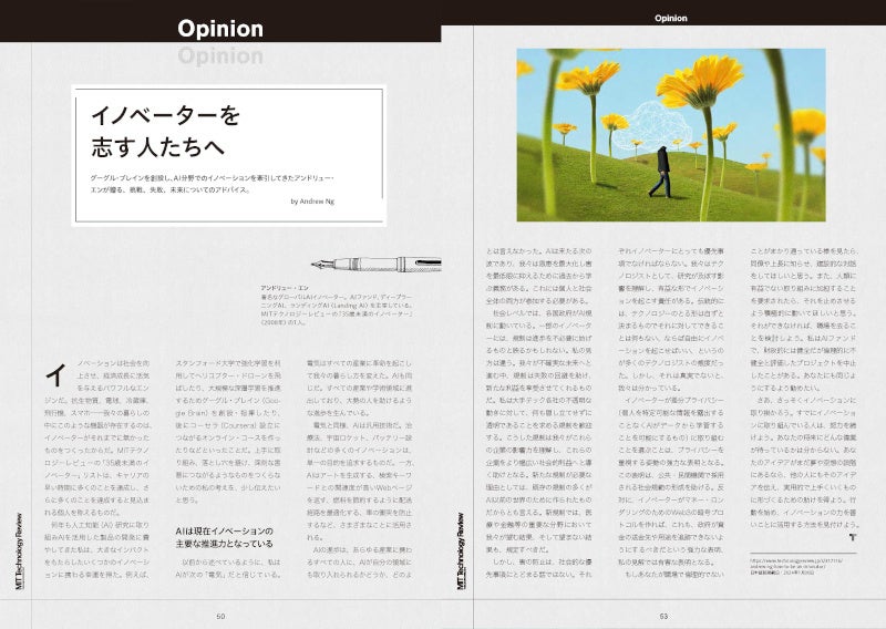 GoogleのAI研究部門「Google Brain(当時)」の創設者で、BaiduのAI部門トップなどを歴任したAI研究の世界的権威、アンドリュー・エン氏による特別寄稿も掲載。ChatGPT以降に注目すべきAI技術や、失敗に終わった自身の「食洗機ロボット」プロジェクトから得た教訓など、イノベーションに関わるすべての人に贈るアドバイスです。