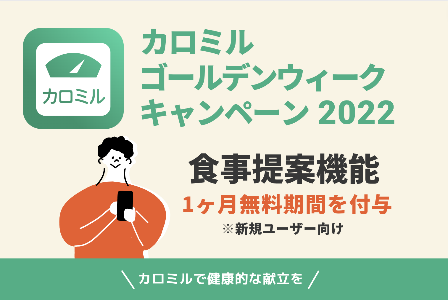 食事・運動・体重管理アプリケーション(以下アプリ)「カロミル」の開発・提供をするライフログテクノロジー株式会社(東京都中央区、代表取締役:棚橋繁行)は、2022年4月27日~5月31日にかけてカロミルのプレミアム機能(有料機能)「食事提案」をはじめて申し込んだユーザーに向けて、1ヶ月無料期間を付与する「カロミルゴールデンウイークキャンペーン2022」を実施いたします。