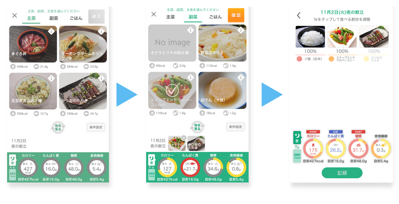 ②開いた時間帯に応じて、「朝・昼・夜」が選択され、目安の摂取カロリーや栄養素も表示されます。