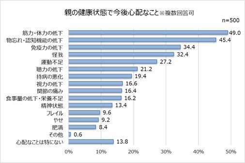 親の健康状態で今後心配なこととして、「筋力・体力の低下」と回答した子世代は約半数で最多、次いで「物忘れ・認知機能の低下」「免疫力の低下」が挙げられました。