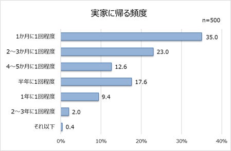 年末年始に帰省した人に帰省頻度について調査したところ、「1か月に1回程度」が最も多く、3割以上の人が回答しました。一方「半年に1回程度」と回答した人を含む帰省頻度がそれ以下の人は約3割いることが分かりました。