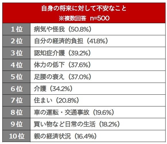 自身の健康面の将来について「不安に思うことは特にない」とする子世代は約2割、8割以上の人が何かしらの不安を抱えています。その中で約半数が「病気やけが」と回答、続いて「自分の経済的負担」、「認知症介護」がそれぞれ約4割という結果になりました。
