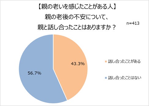 自分の親に老いを感じている人の中で、親と老後について「話し合ったことはない」人は半数以上いることが分かりました。その理由を聞くと、「親はまだ元気だから」、「何から話せばよいか分からないから」とそれぞれ3人に1人の人が回答しました。話す必要はあると思っていても話し合えていない人がいることがうかがえます。